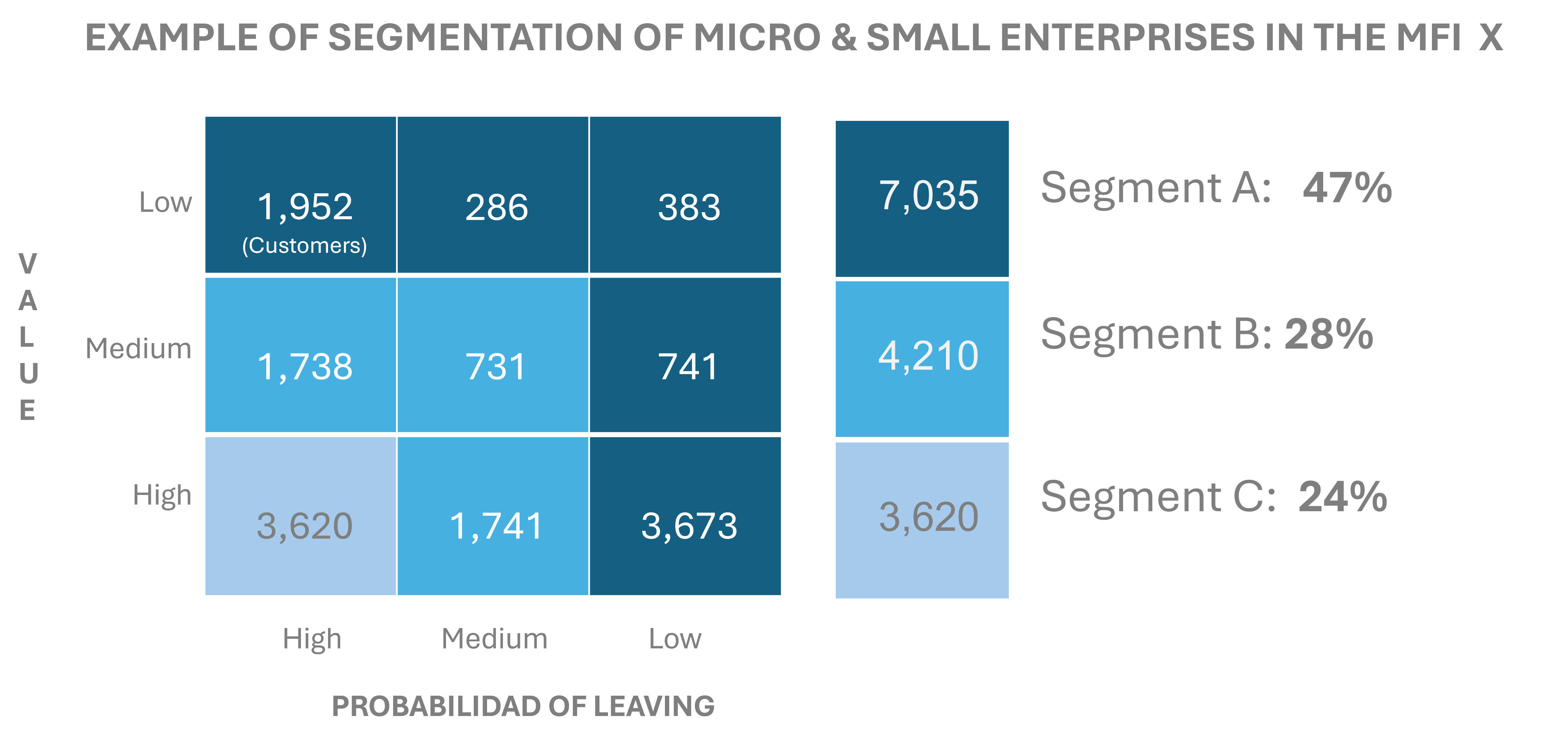 Predictive tools, such as desertion scorecards, can help MFIs proactively identify clients who are at risk of leaving. The matrix below illustrates how to segment customers based on both their likelihood of attrition and their overall value to the institution—enabling more targeted retention strategies.